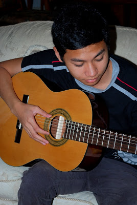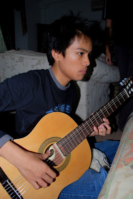 YAY he has arrived. And he brought a weapon O_O yeah its a guitar haha he got a new guitar its soo cool. Nyaman di pigang ah. Dunno what its called though.